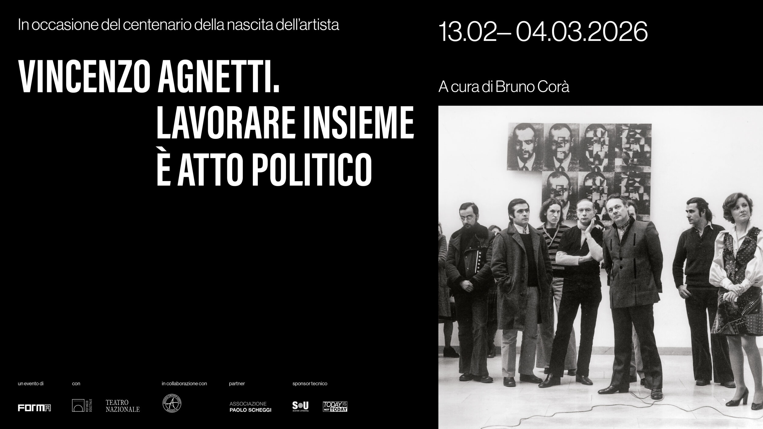 The event is produced by Forma Edizioni with Rifugio Digitale and Teatro Nazionale, in collaboration with the Archivio Vincenzo Agnetti. The project partner is the Associazione Paolo Scheggi, with technical support from Scena Urbana.